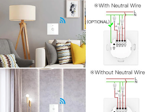 • Flexible Verdrahtungsoptionen: Dieser Schalter ist in zwei Versionen erhältlich – mit einem einzelnen stromführenden Kabel oder einem Neutralleiter – und passt sich so an verschiedene Verdrahtungskonfigurationen innerhalb eines einzelnen Geräts an.