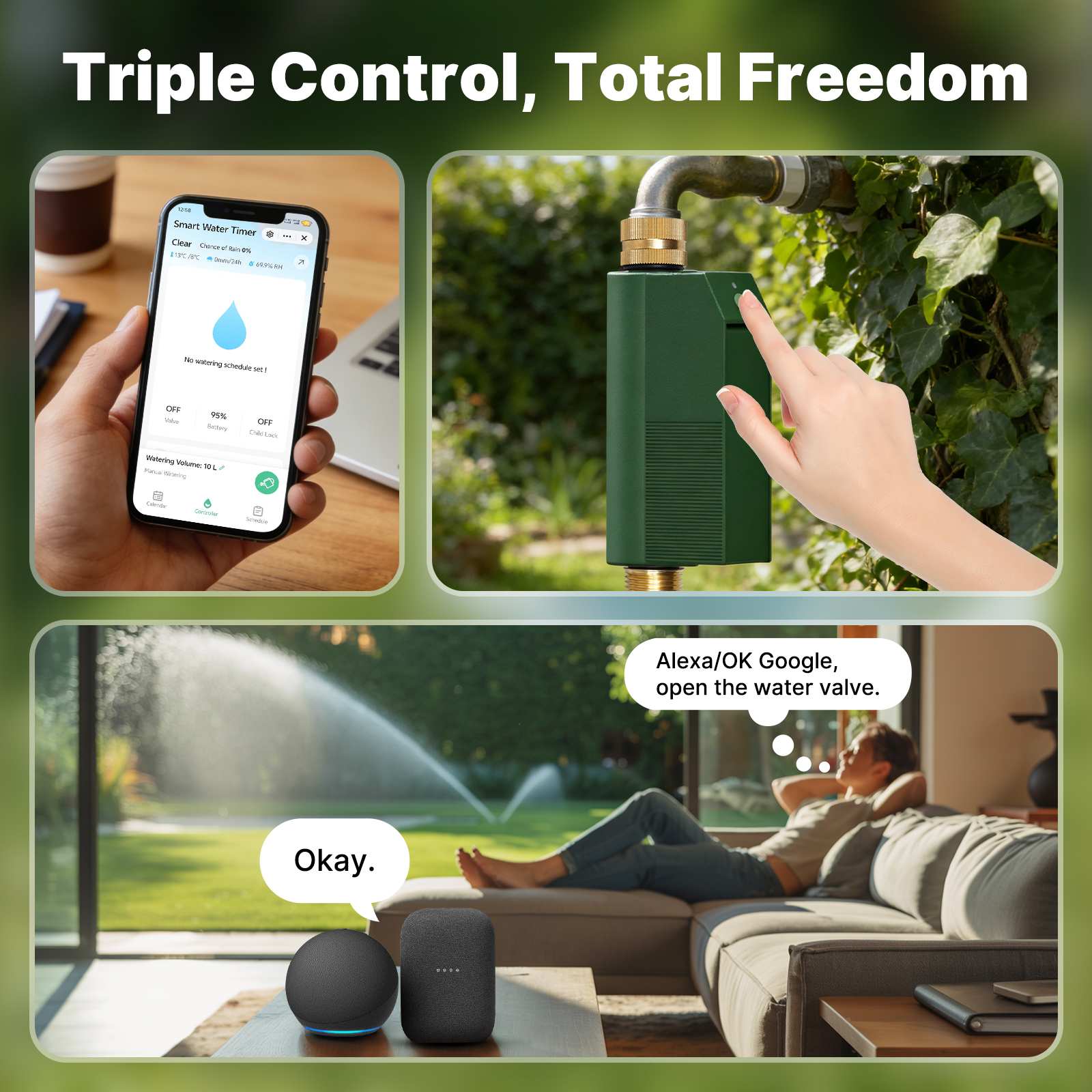 Control your watering system anytime via the mobile app or voice commands with Alexa and Google Home. Set flexible watering schedules based on time, duration, or volume, and let the system run automatically—freeing your hands while maintaining a healthy garden.