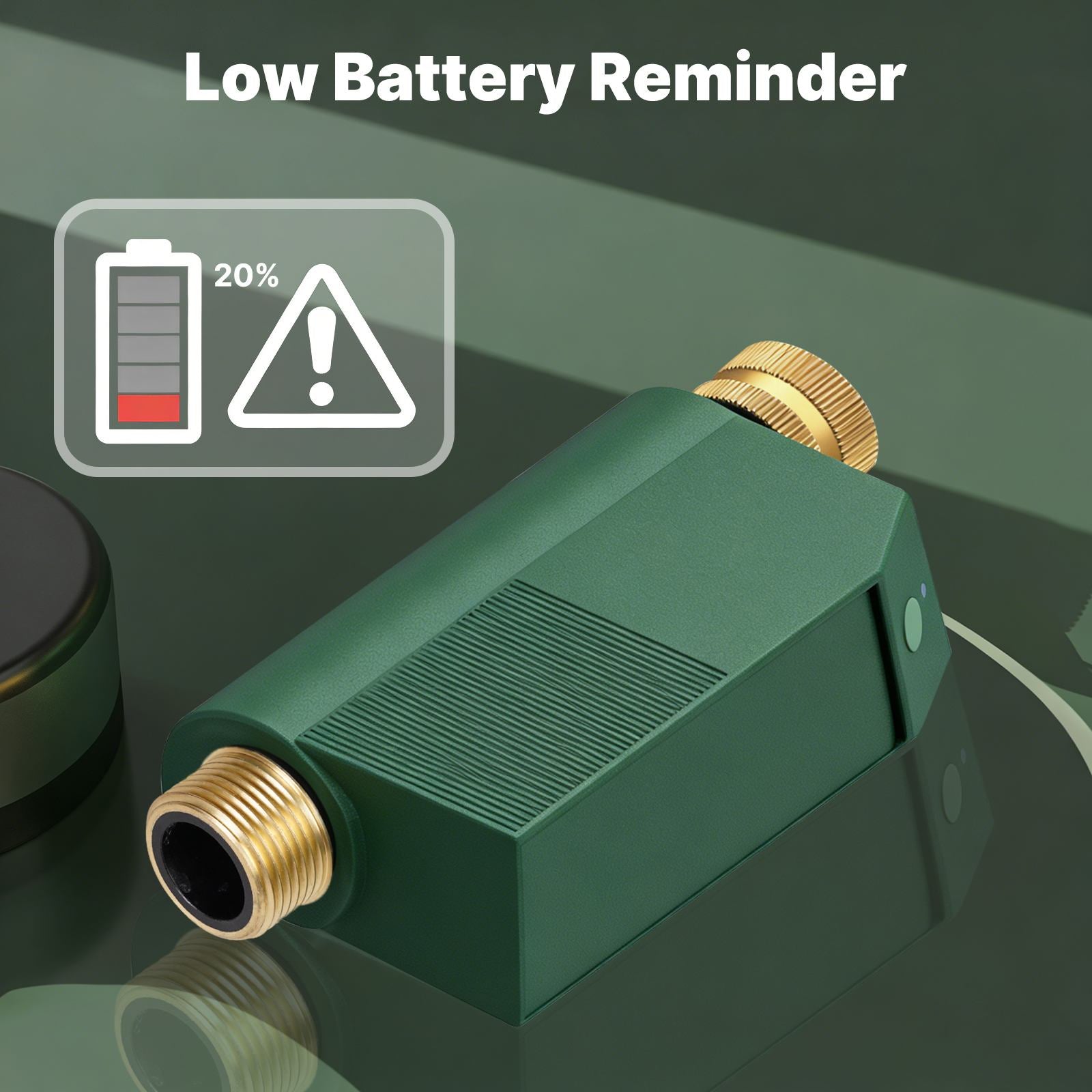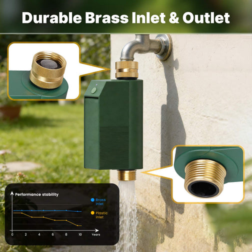 With a powerful 35L/min high flow rate, this smart valve ensures strong and consistent water pressure, covering your entire garden without dead zones. The durable brass inlet and outlet connectors provide long-lasting performance and leak-resistant reliability compared to traditional plastic fittings.
