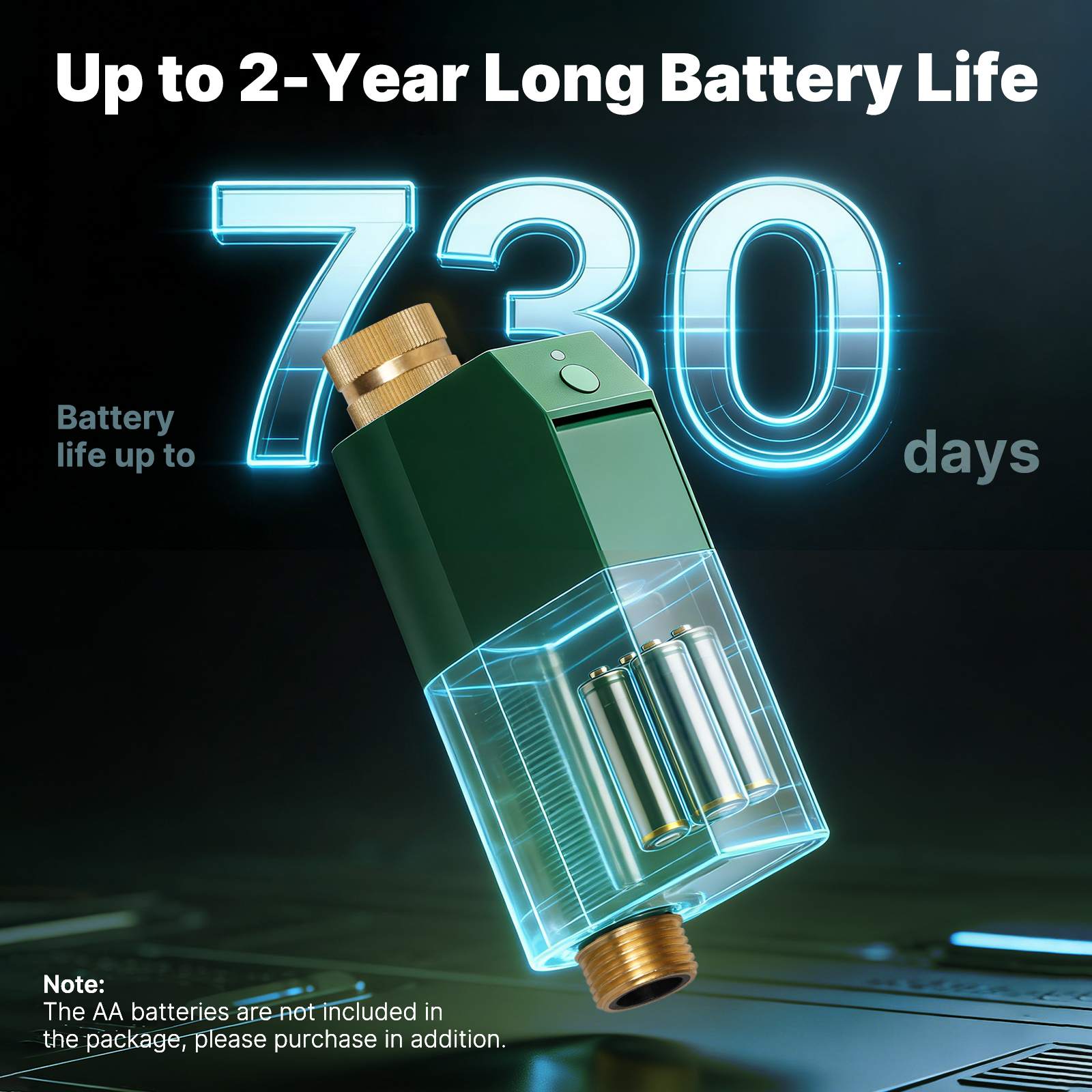 Built for outdoor use, the device features an IP65 waterproof rating and energy-efficient design powered by 4 AA batteries lasting up to 2 years, making it a reliable solution for gardens, lawns, greenhouses, and irrigation systems.