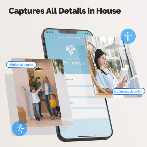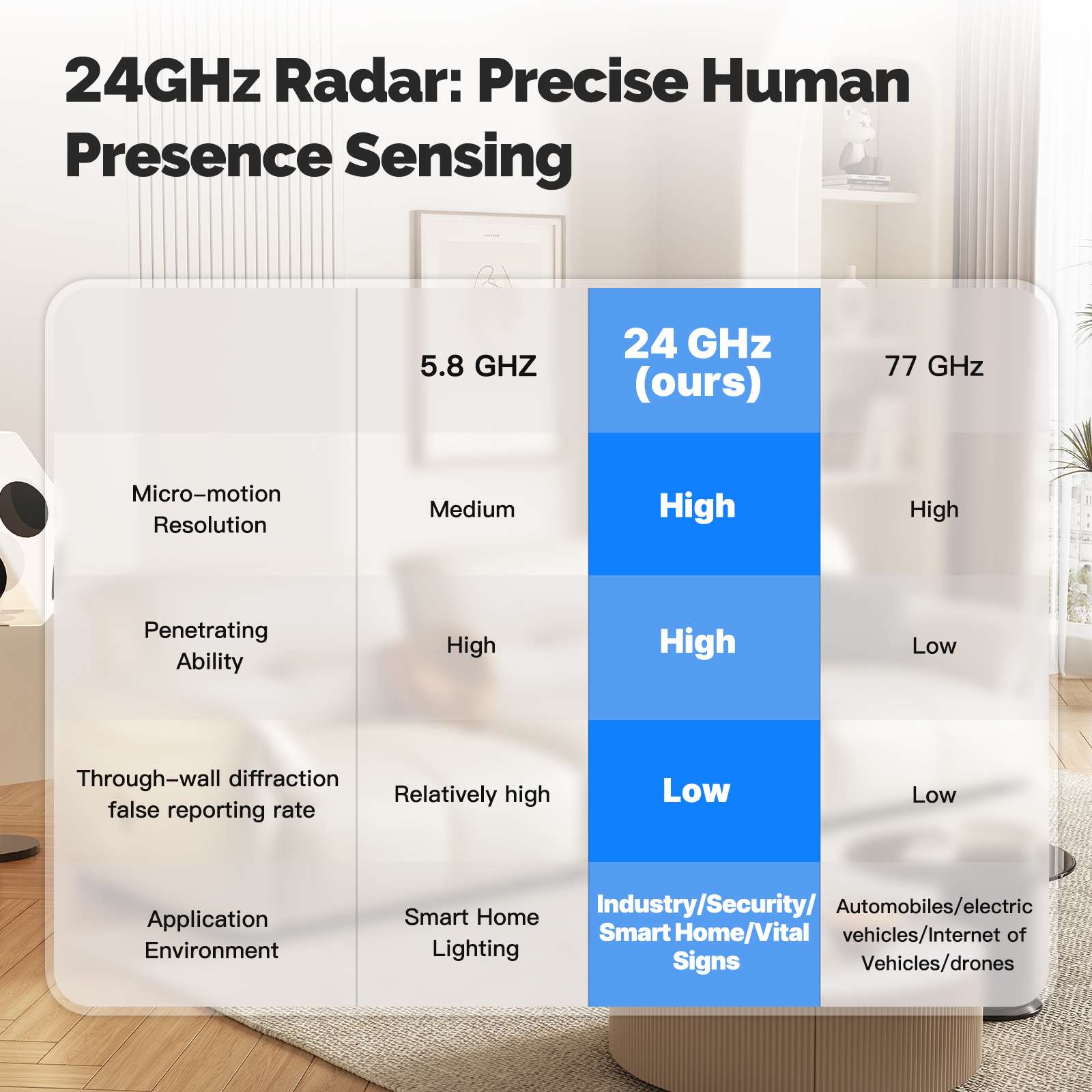 • Tecnología de radar: Equipado con un sensor de radar de 24 GHz combinado con tecnología de detección de movimiento PIR, ofrece precisión y confiabilidad superiores en la detección de movimiento.