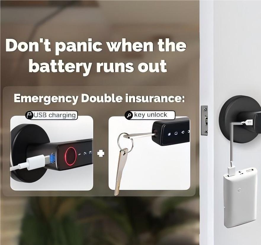 If the batteries run out, you can use the temporary charging port to recharge or use the key for manual unlocking.