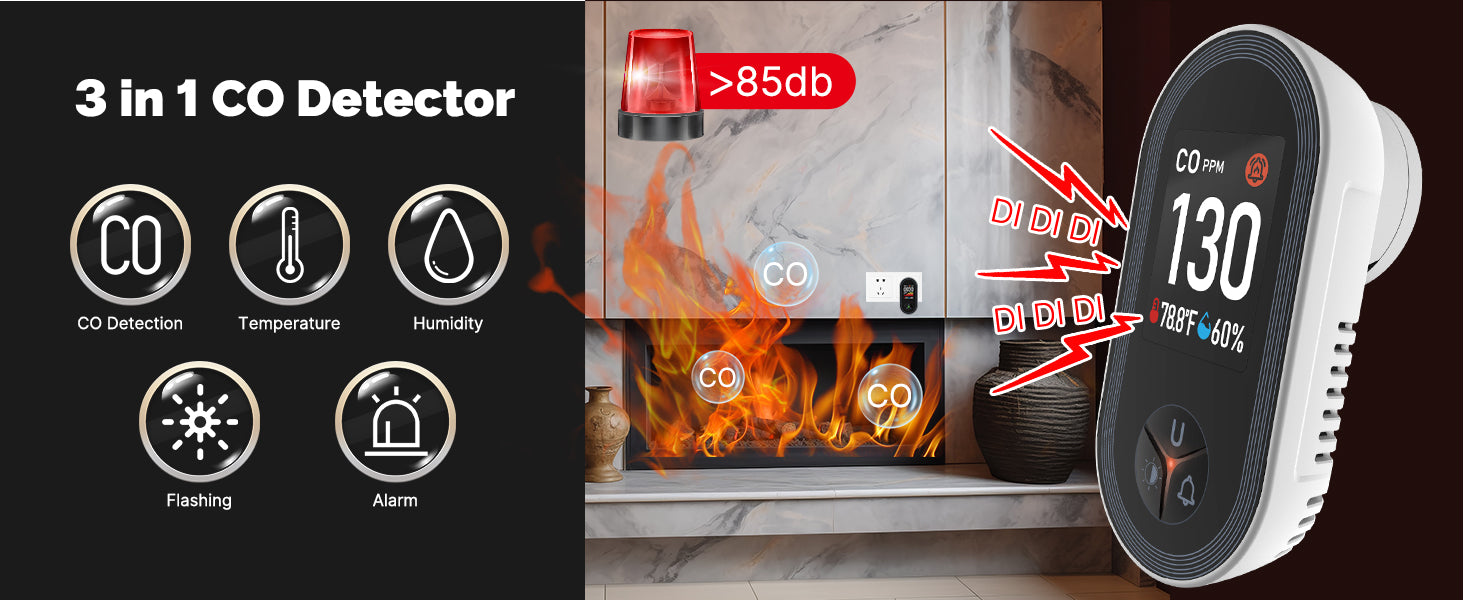 • Loud & Accurate Alarm – Uses a high-sensitivity electrochemical sensor. When CO levels exceed 150 PPM, it triggers a sound and light alarm with a loud 85 dB alert.