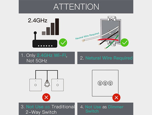 • Neutral Wire Requirement: To ensure proper functionality, this switch requires a neutral wire in your switch boxes. This ensures a stable and reliable connection.