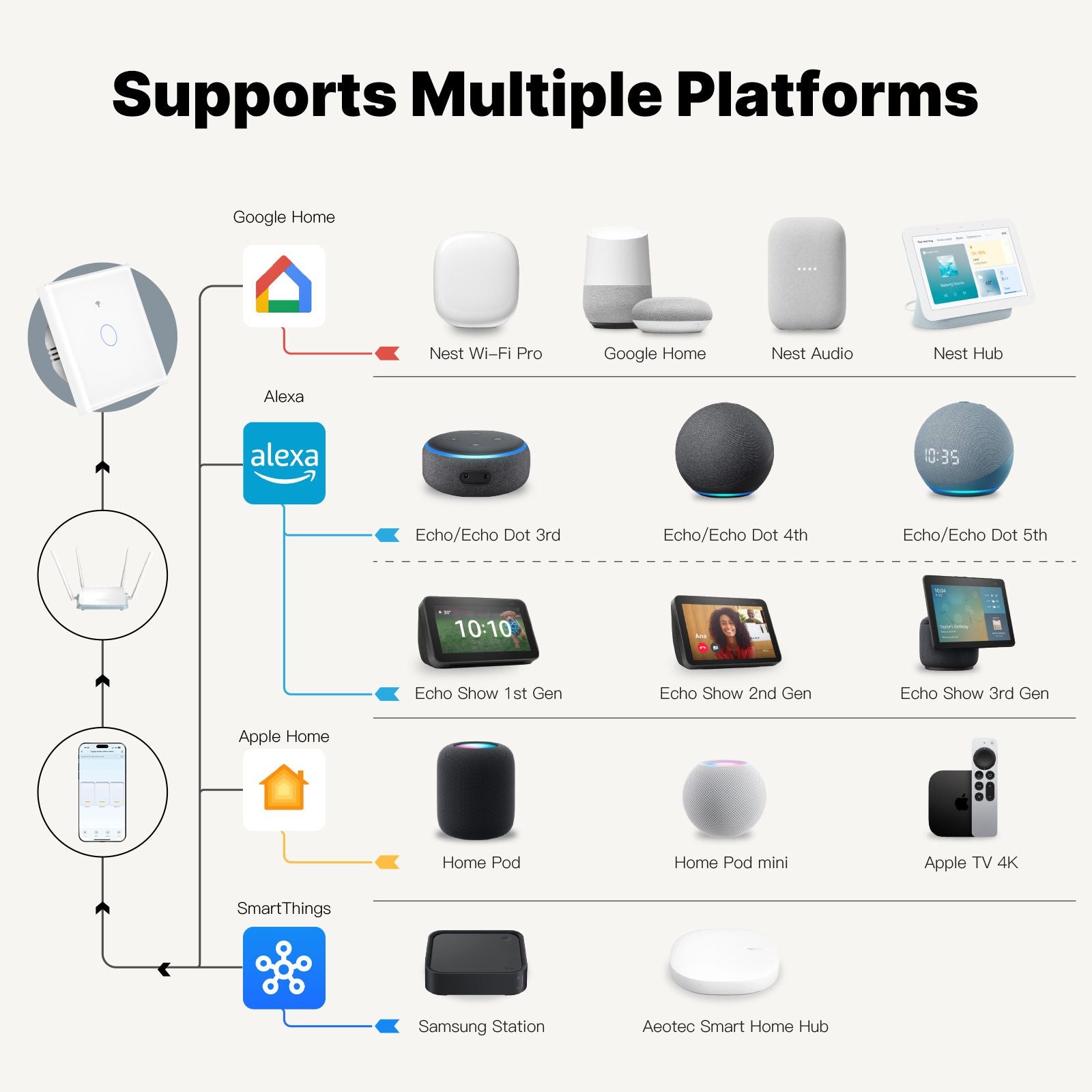 With its multiple control options, you can easily operate the switch via voice commands, mobile app, or use the timing function to schedule your devices' on/off times. Whether you're at home or on the go, controlling your smart devices has never been easier.