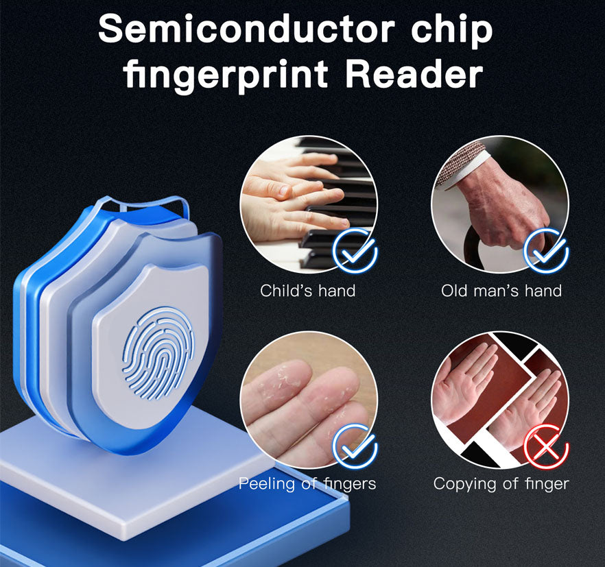 • Advanced Security Technology: Semiconductor fingerprint reader prevents unauthorized duplication. Shielded against electromagnetic pulsers for enhanced security.