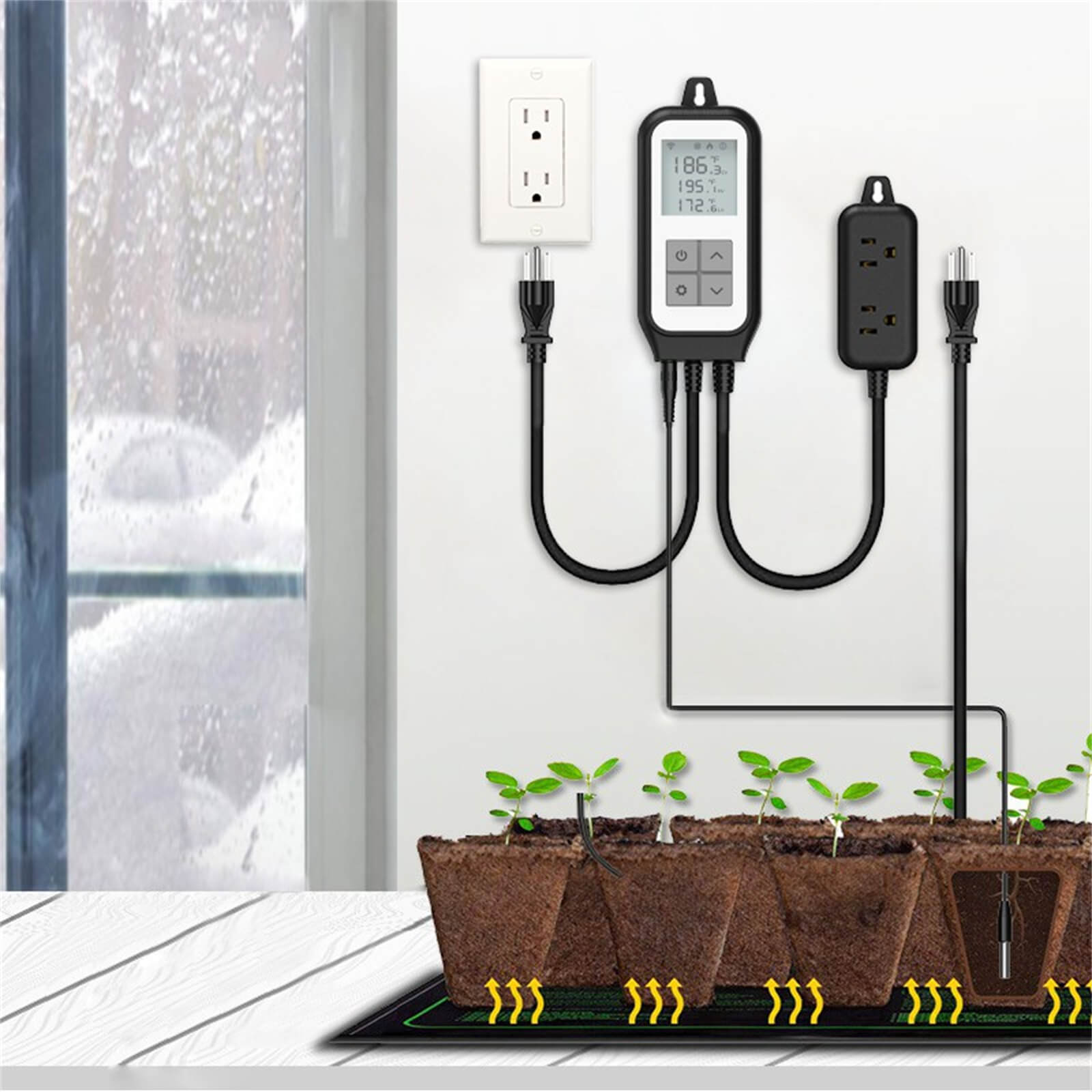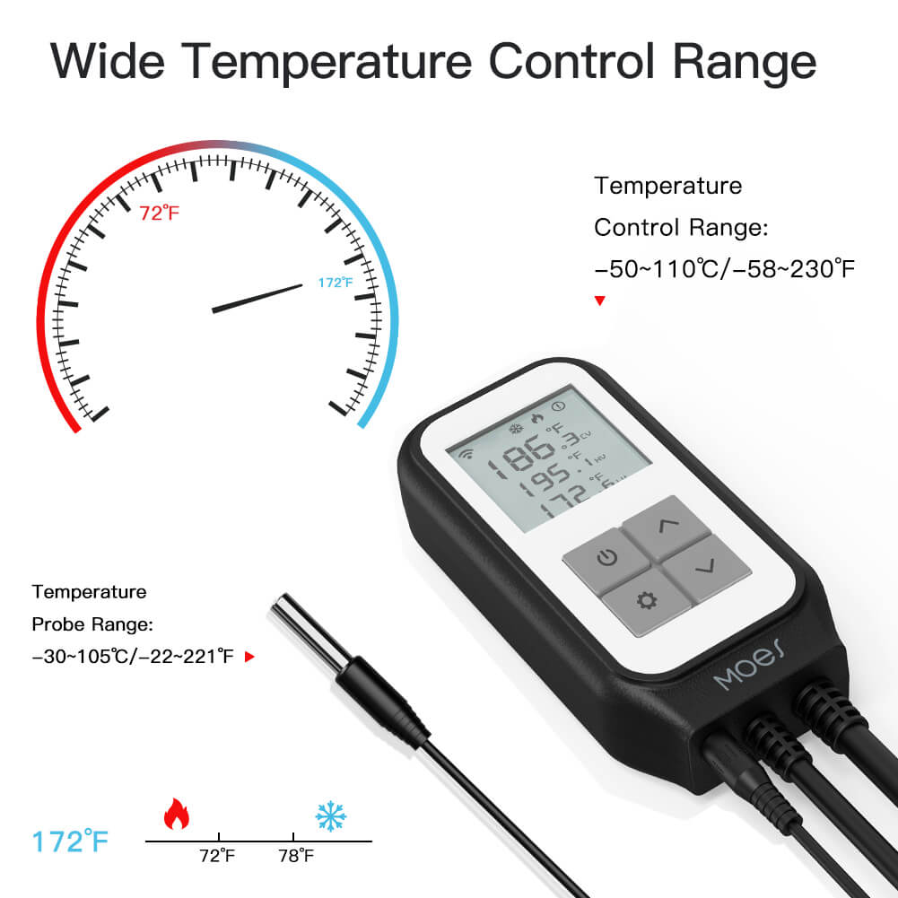 • Wide Compatibility: This WiFi smart digital temperature controller support -22~221℉ / -30~105℃, fits well for extreme temperature in summer or winter; Each outlet support 10A, 1250W, suitable for main heater and cooler; Ideal for homebrew, fermentation, breeding, incubation, greenhouse and more with its wide compatibility featured.