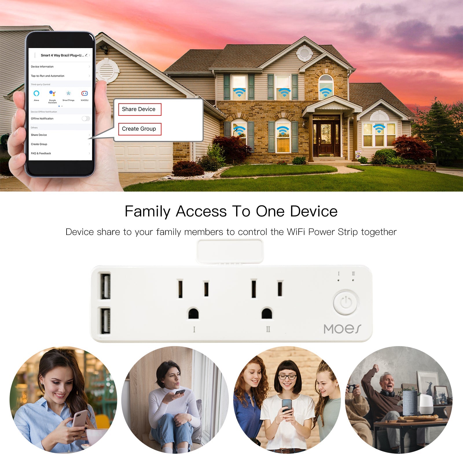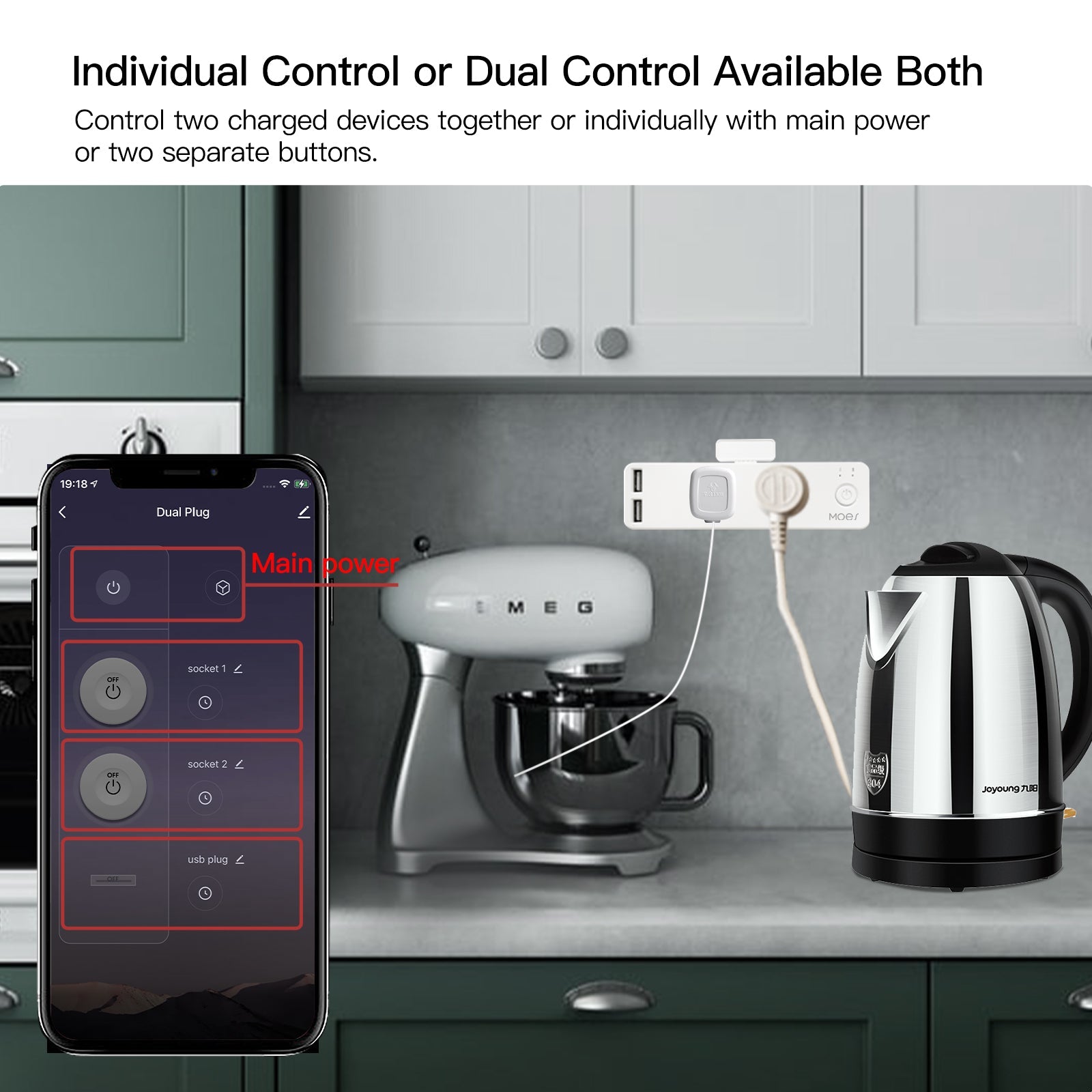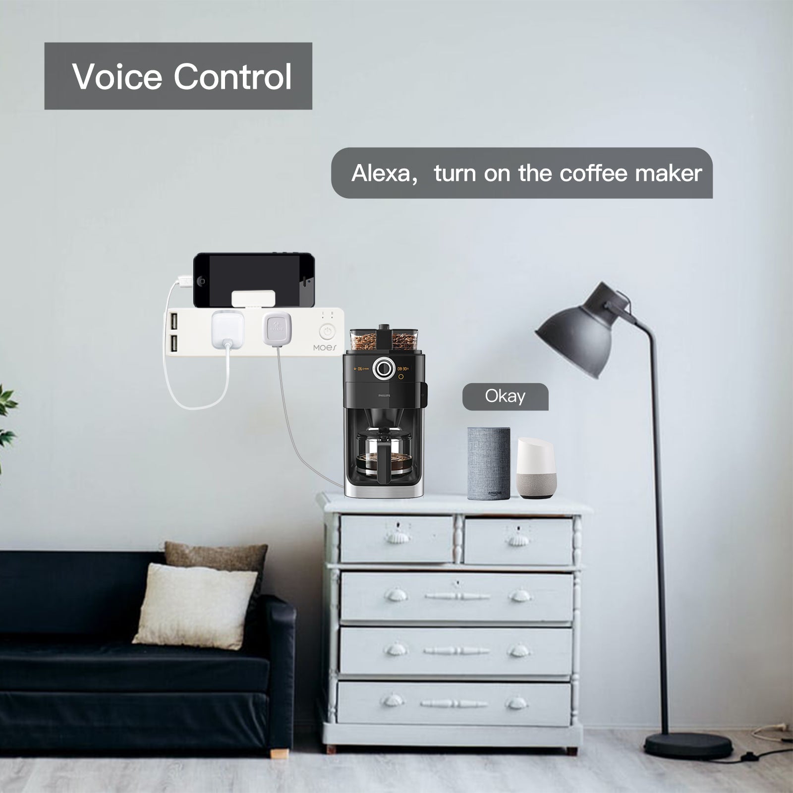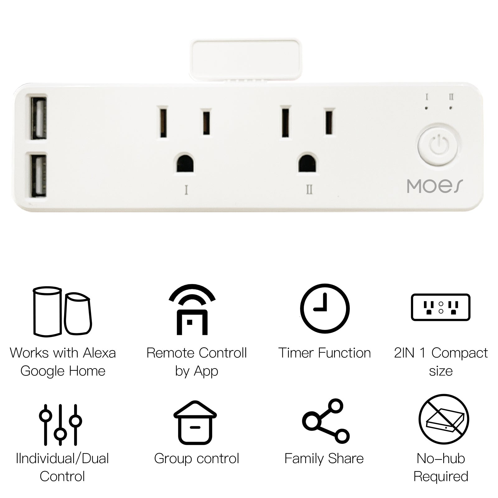 • MOES App &Alexa Google Home Voice Control.Individually ON/OFF control for the 2 outlets and 2 USB charging port without any interference.