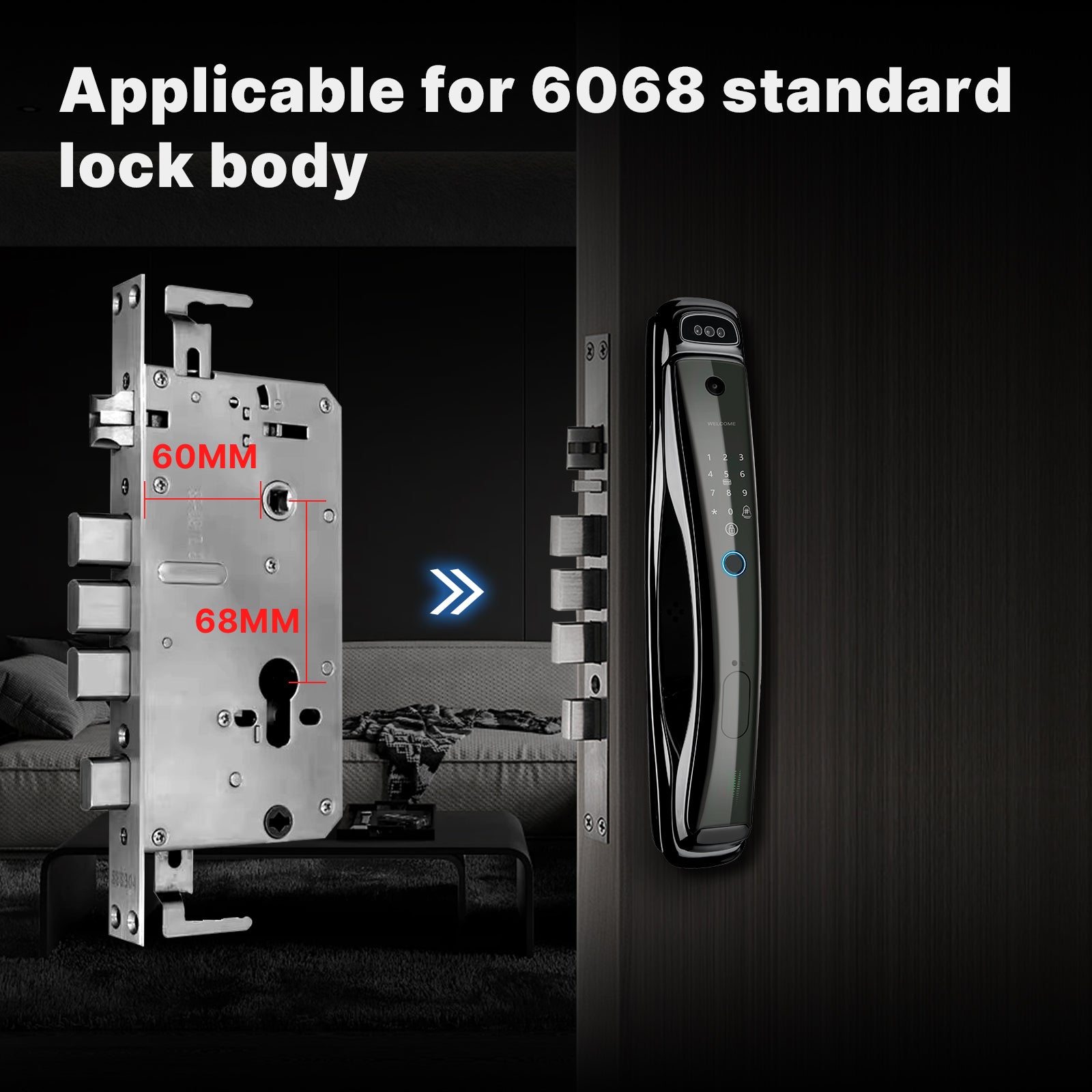 Experience cutting-edge security with our Smart Facial Recognition Door Lock featuring 3D facial recognition technology, a high-definition 1MP camera, semiconductor fingerprint recognition, anti-theft alarm, and compatibility with the 6068 standard lock body.