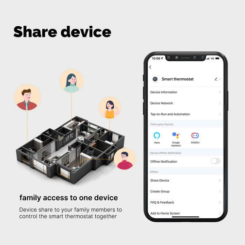• Share Devices: Share devices with your family to jointly control the smart thermostat.