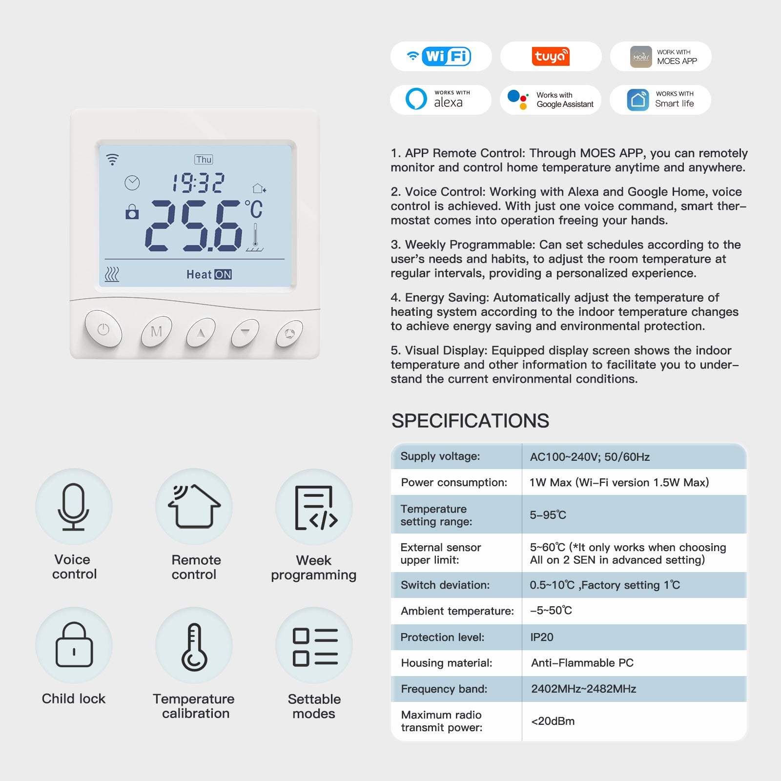 The MOES Thermostat prioritizes a sleek, user-friendly design and an attractive appearance, blending seamlessly with various decor styles. This WiFi Smart Thermostat Temperature Controller is suitable for water/electric floor heating and water/gas boilers. Featuring an intuitive button design, it offers advanced temperature control for your home. With the convenience of a smart app, you can remotely control your home’s temperature for optimal comfort.
