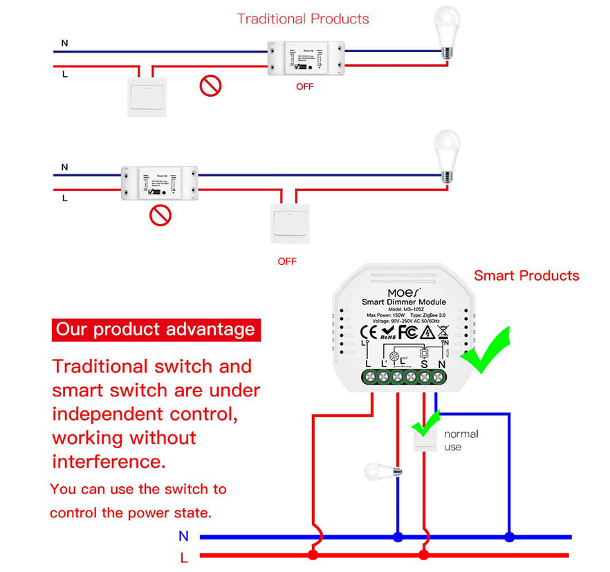 • Compatibility: This module is compatible with traditional switches, allowing you to still use your existing switch alongside the smart features.