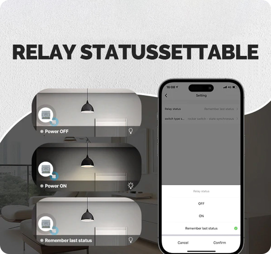 • RELAY STATUS SETTABLE: According to your living habits and needs, set the device on/off after the power on or maintain the original switch state, so that your home equipment can operate normally.
