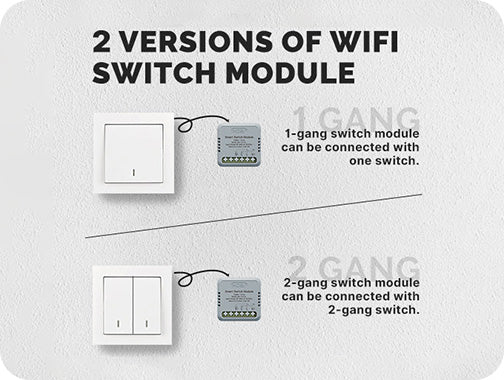 • 2 VERSIONS OF WIFI SWITCH MODULE: Choose your needed witch module of 1 gang and 2 gang . 1-gang switch module can be connected with one switch while 2-gang switch module can be connected with 2-gang switch.