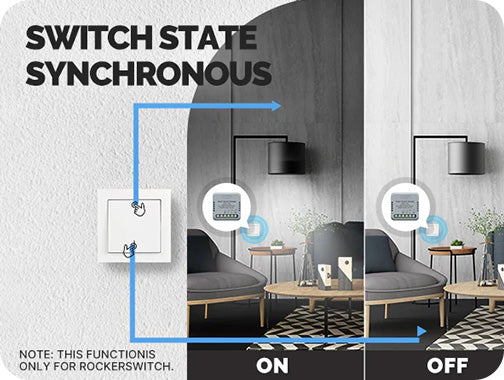 • SWITCH STATE SYNCHRONOUS: Supporting the double control of two matched roker switches. Two operation types of flip to change on/off state and state synchronous can be set. After setting state synchronous, the on/off position is fixed and synchrounous with each switch.