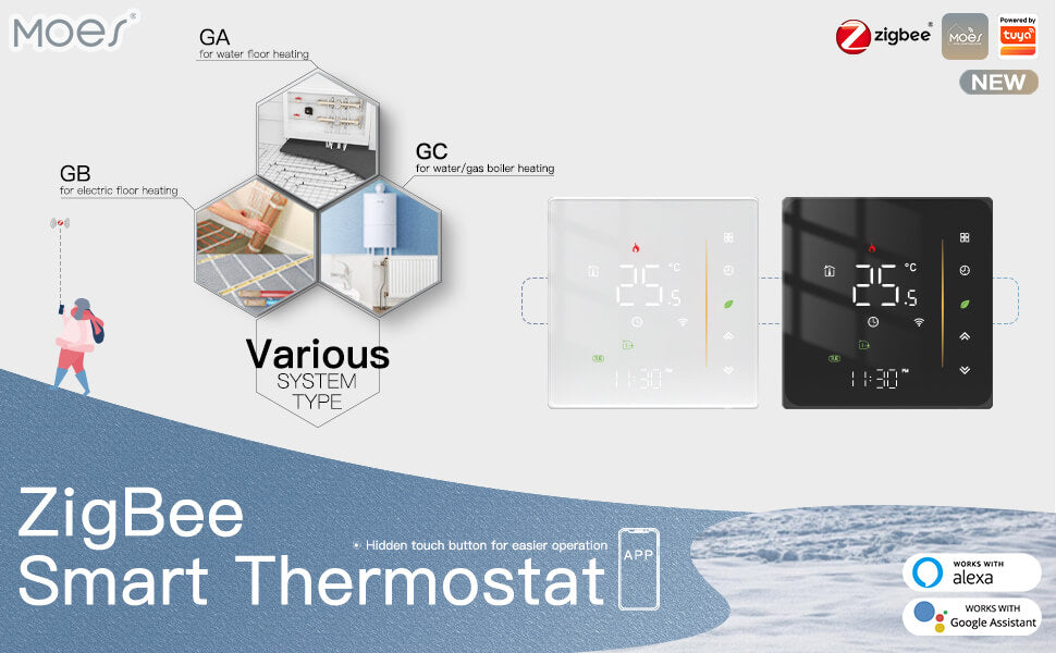 • Functional Heating System with MOES Tuya ZigBee Hub: Control with Tuya ZigBee protocol included for water floor, electric heating and water gas boiler heating system controlling under MOES ZigBee hub,easily enable the temperature correction and high limit temperature ceiling for better room temperature,focusing on making simple, human, delightful feelings for your various decoration styles.(Note: current load is 5A for water heating and gas boiler,16A for electric floor heating.)