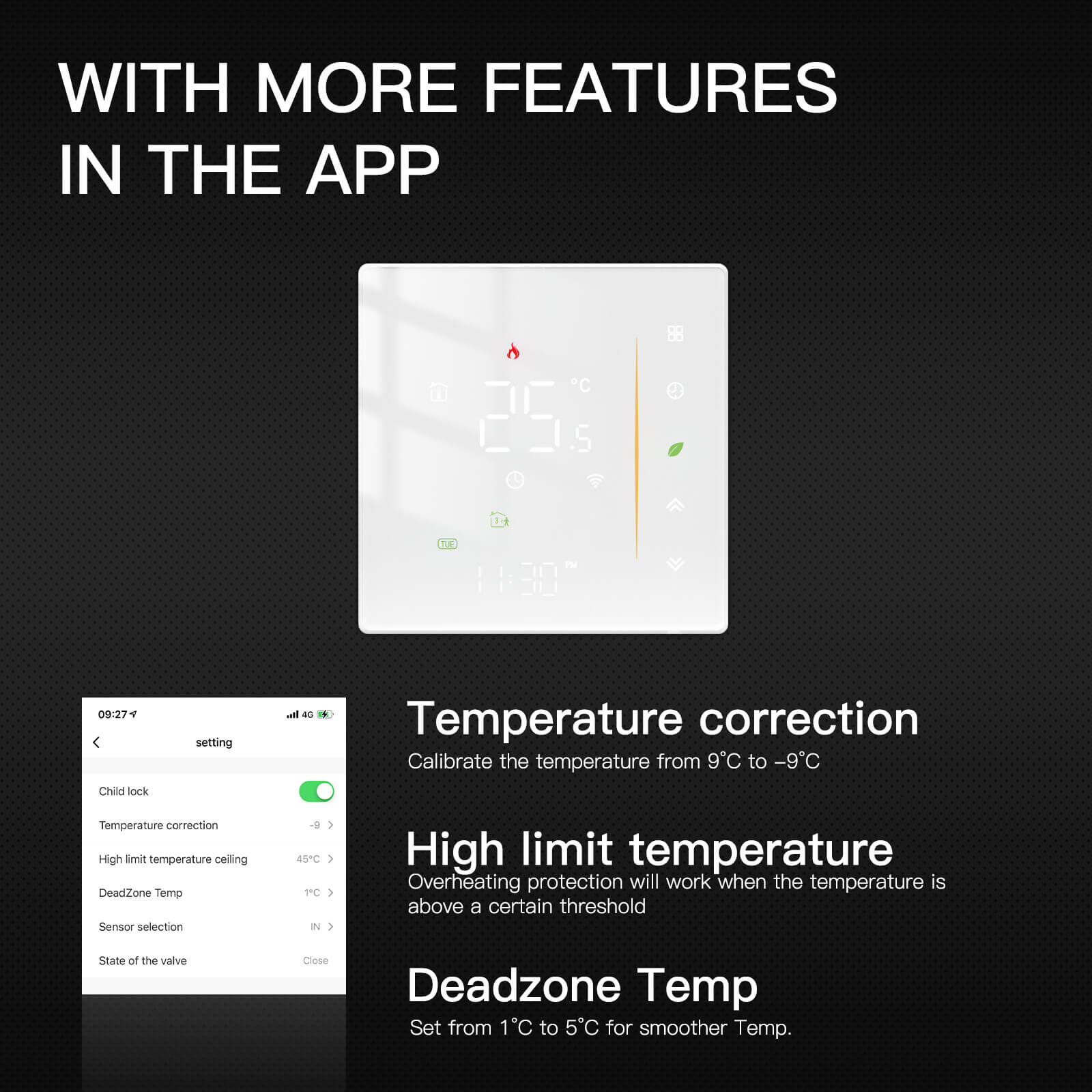 • MOES APP/Voice Assistants Compatible with Child Lock and Sensor Selection: Working with Alexa Google Home offers simple voice command control;New arrival is updated with the child lock,deadzone Temp. and sensor selection functional in the APP.