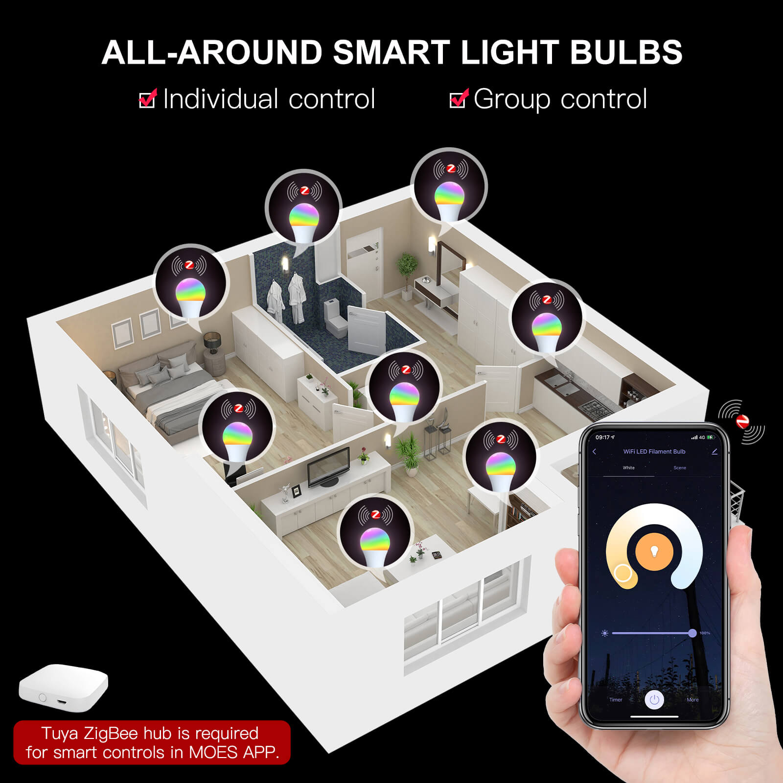 Transform your space with Zigbee smart bulbs. Enjoy DIY color options with white and 16 million RGB hues, controlled via MOES/Tuya Smart App with Zigbee hub. Energy-efficient, cutting electric bills by 90%. Sync lighting with music, choose from 8 modes and set timers for sleep and wake-up lighting. Control remotely and by voice with Alexa/Google Home.