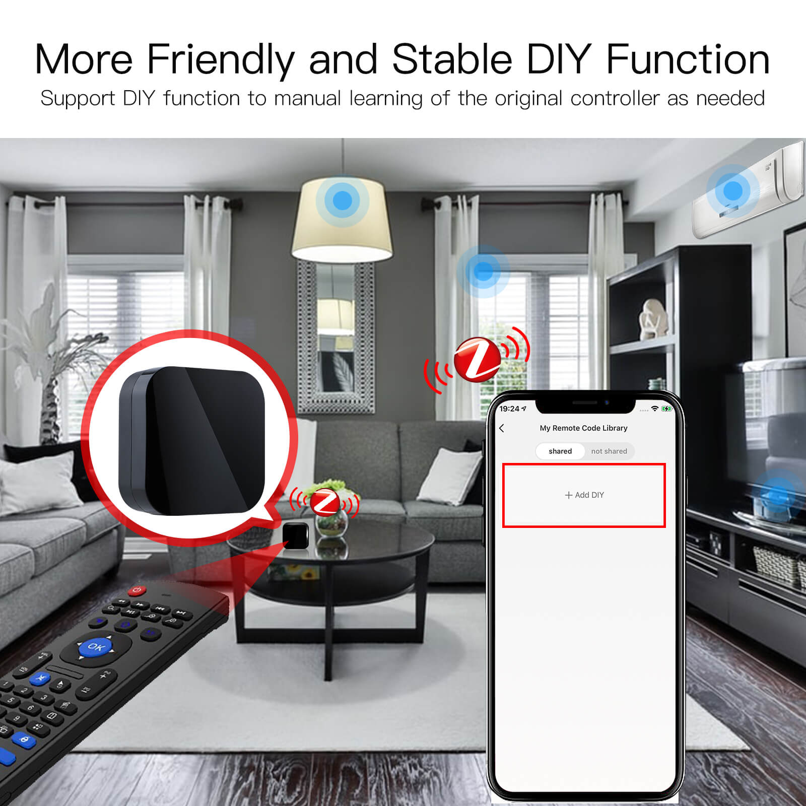 • Customized DIY Copy Function: If you can not find IR device brand in MOES App, programable DIY learning function may help to copy same function from original remote.Most IR remote control Devices will be applicable such as fireplaces, heater, ceiling fans, please confirm you have a traditional remote of the infrared devices for DIY learning by the ZigBee IR remote.