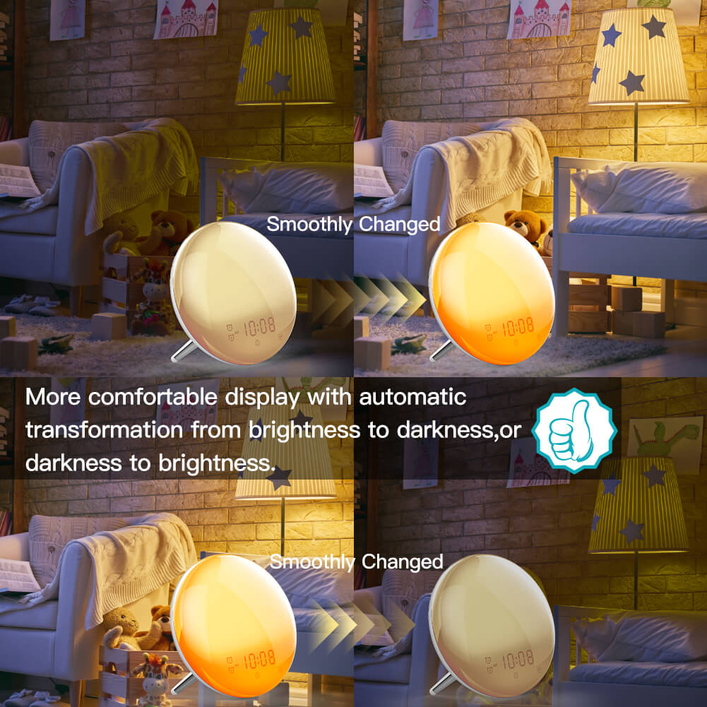 • 3. Sunrise/Sunset Simulation Alarm Clock: Select the time you want to wake up and let your gentle sunrise keep you refreshed. From 10 to 60 minutes before the selected wake up time, the light will turn on and will initially be very soft, gradually becoming brighter and brighter. And sleep with dimming sunset. You can adjust the brightness from 5% to 100% to your own need. And the automatic adjustment mode of the brightness leaves no more trouble or worry about the bright light that hurts your eyes to some extent.